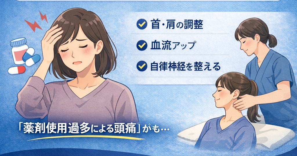 を行うことで、頭部の血流・神経刺激の負担を軽減し、頭痛の頻度や強さの改善を目指します。